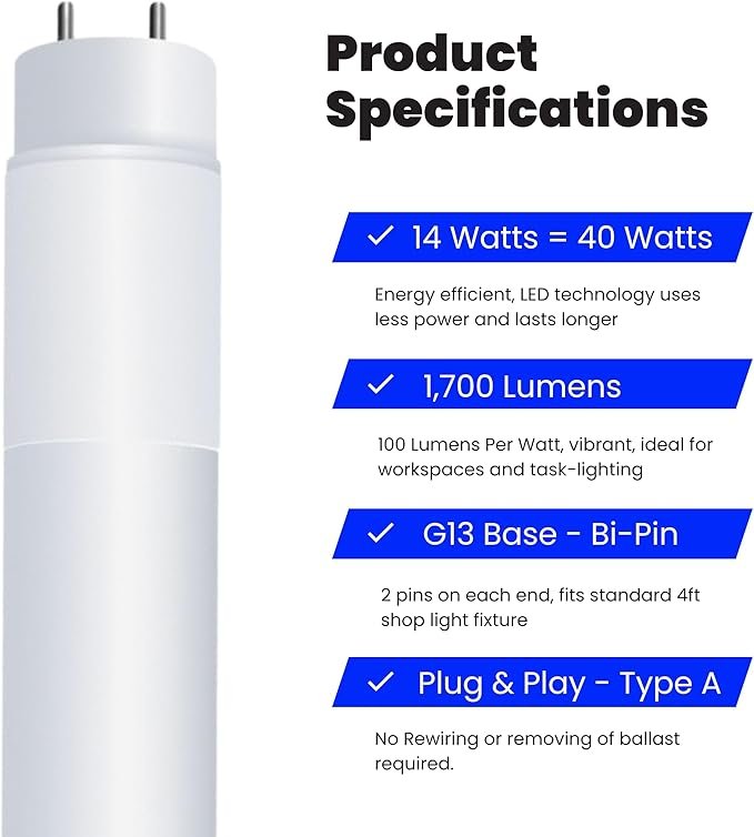 - ✅ ENERGY SAVING – These 40-watt equivalent LED tubes only use 14 watts and produce 1700 lumens; instant on brightness; Emits no ultraviolet light which makes it safe to use in your garage, shop or warehouse ; 100% mercury free;