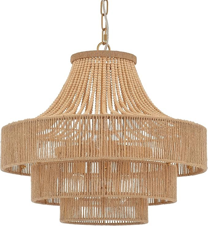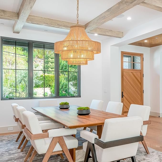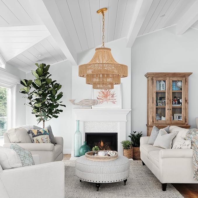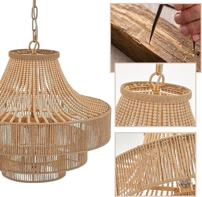 - Boho Combination: This boho chandelier light fixture combines coastal elements with rattan and wood beads. The top features over 1,000 high-quality wood beads, preserving their natural color and texture, while the bottom showcases rattan crafted into three round cages. This blend adds a natural and beautiful vibe to your room.